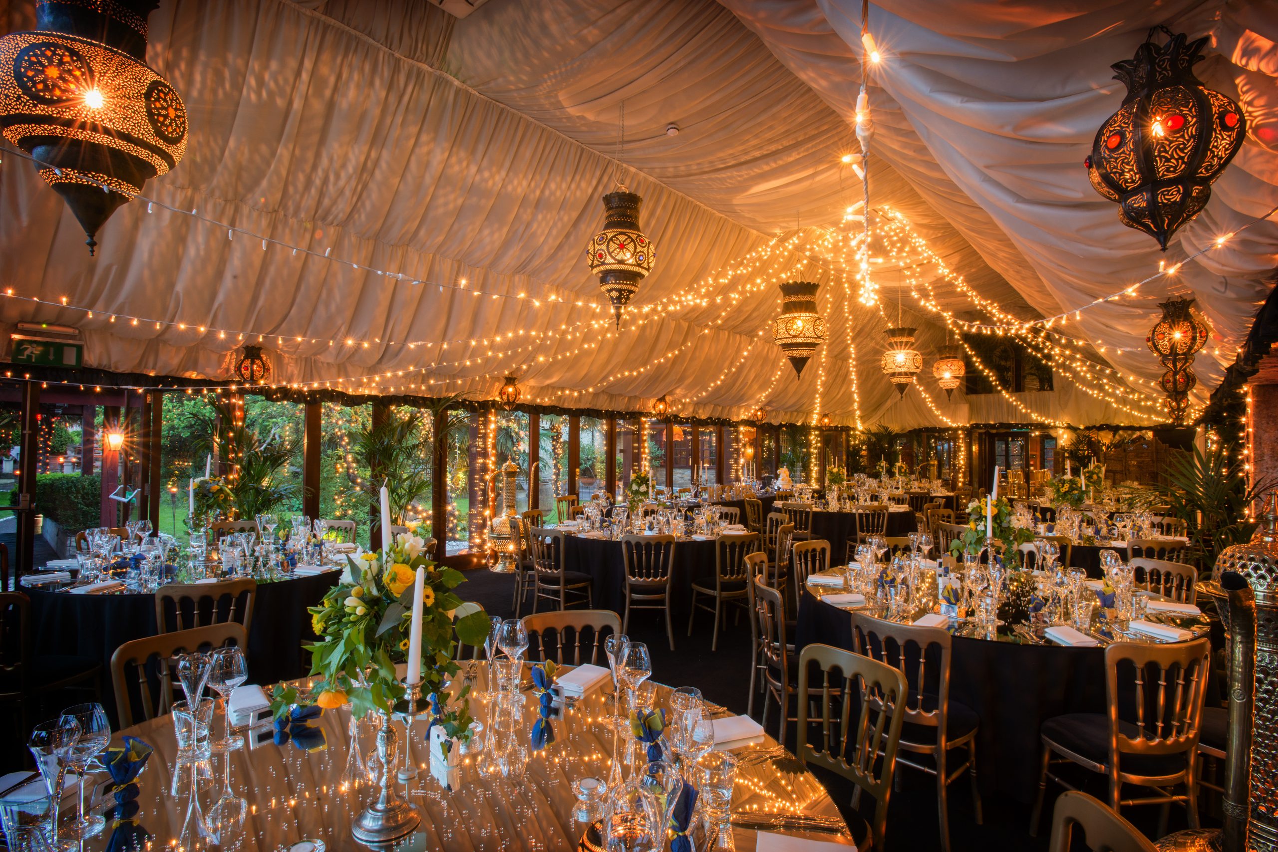 The Glasshouse offers an effortlessly luxurious setting, complete with a private bar, opulent Moroccan Lounge — with the option to transform into your own private dance floor — alongside an expansive terrace. Outside, Moroccan booths and a private al fresco bar create the perfect space for stylish celebrations, while an exclusive fairy-lit woodland copse provides a dreamy backdrop. An integrated sound system flows seamlessly from indoors to out, setting the tone for guests to dance late into the evening.
